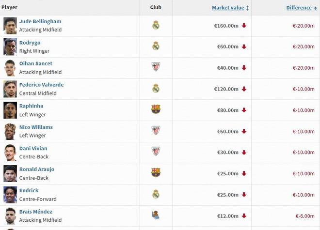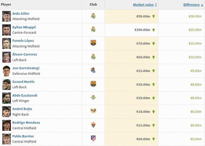 本次身价更新中,亚马尔身价保持不变,仍为2亿欧。姆巴佩身价上涨2000万欧,与亚马尔并列第一。贝林厄姆身价下跌2000万欧,跌至1.6亿欧元,位列第三。维尼修斯和佩德里身价保持不变,分列第四、第五。巴尔韦德身价下跌1000万欧,身价来到1.2亿。阿尔瓦雷斯身价保持不变,保持在1亿关口。这样,本次身价更新后,西甲有七位球员身价上亿。